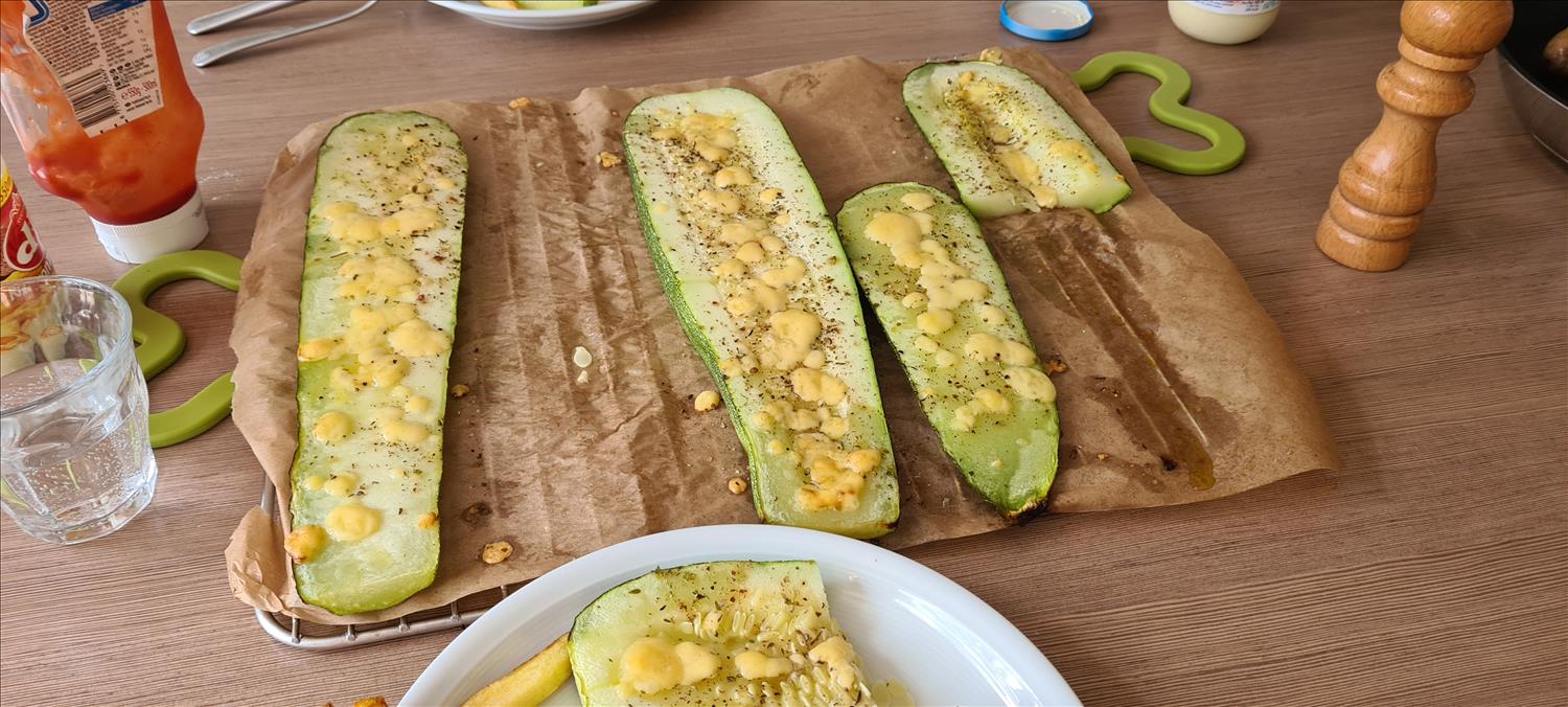 Plaats de courgette op een bakplaat met bakpapier en zet ze +- 20 minuten in de oven op 180 °C.