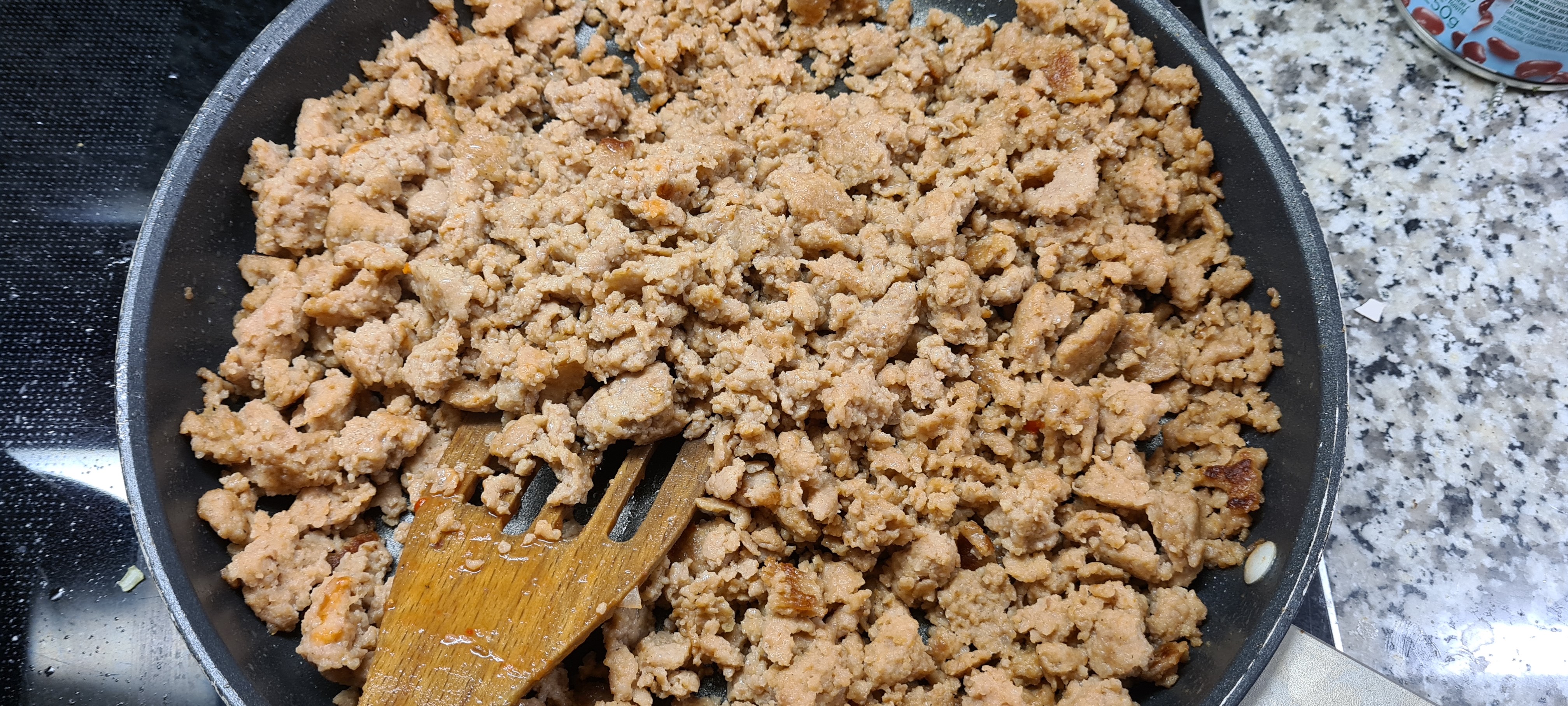 Bak ondertussen het gehakt in een aparte pan.