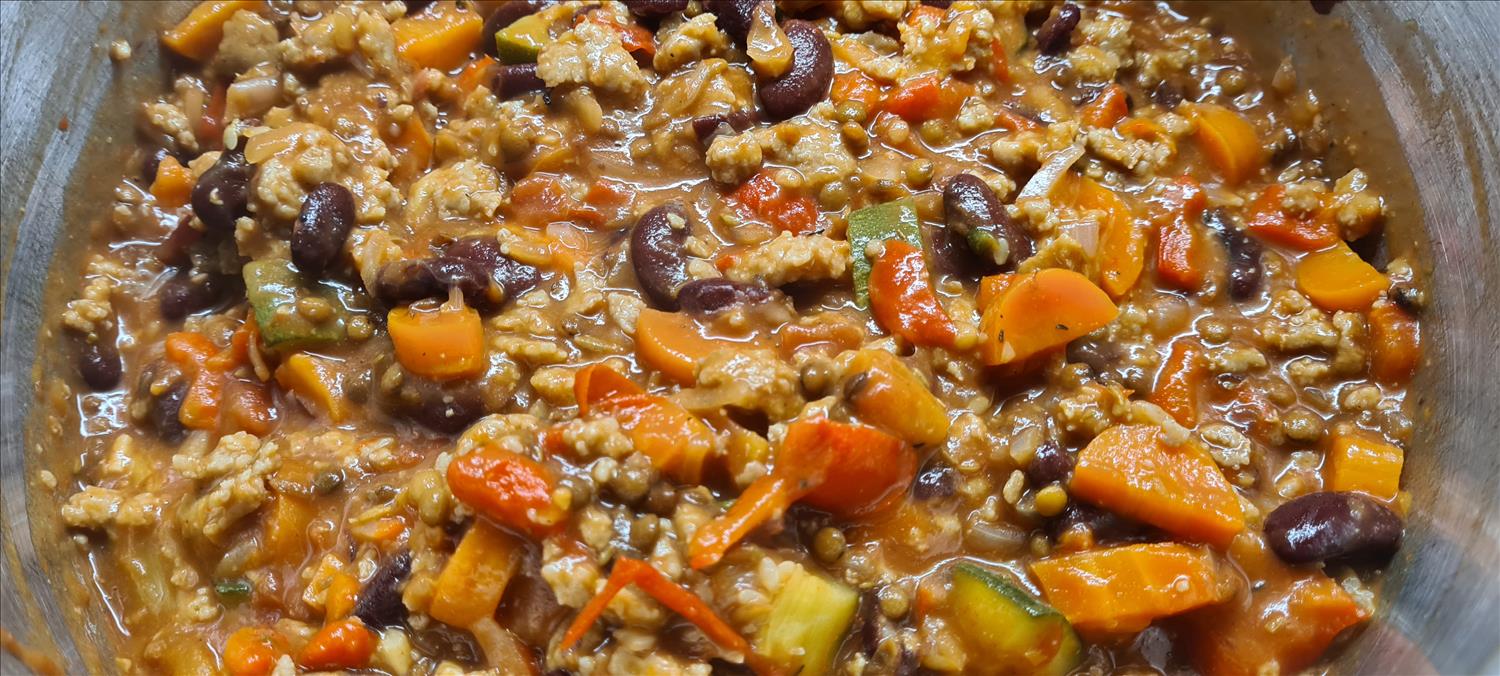 Heerlijke pittige chilli con carne met rode kidneybonen en veel andere groentjes!